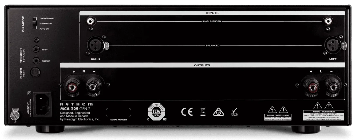 The MCA 525 GEN 2, MCA 325 GEN 2, and MCA 225 GEN 2, designed and Crafted in Canada, are like no other amplifiers in the world: custom low noise high-power toroidal transformers; high-current bipolar output transistors; high-quality filter capacitors; advanced power supply regulators; oversized aluminum heatsinks; custom-designed dual binding posts; and patented auto-on/off circuitry. Superior craftsmanship that is reflected in clean, clear, audiophile-quality sound from top to bottom of the frequency spectrum.