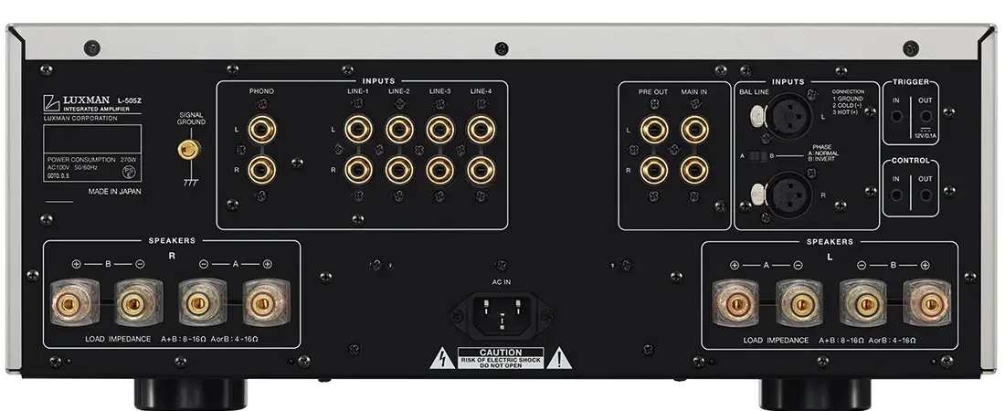 The L-505Z incorporates LECUA (Luxman Electronically Controlled Ultimate Attenuator), a technology that ensures smooth, detailed volume control with 88 steps. This high-clarity attenuator minimizes sound quality degradation, offering excellent balance and intuitive operability. Despite its compact, solid-state IC circuit design, LECUA maintains the natural, tactile response of a traditional volume knob, allowing for precise adjustments even from a distance using the remote control.