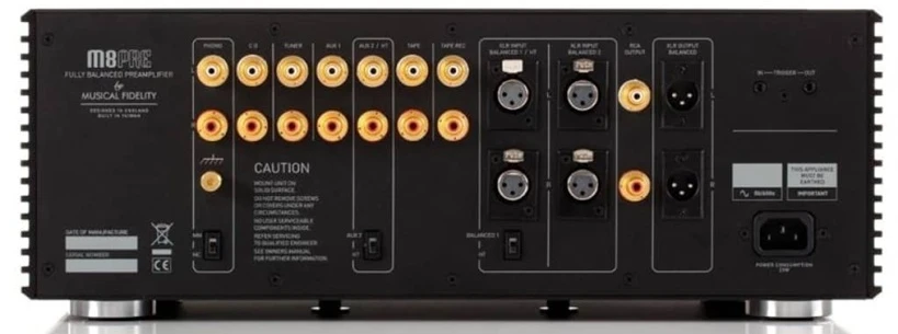 The Musical Fidelity M8s Pre Amplifier has very high input overload margins. This means that it has a completely stress free sound. The outputs are very low impedance and high current so that it can drive virtually any power amp in existence through any length cable (balanced or single ended).